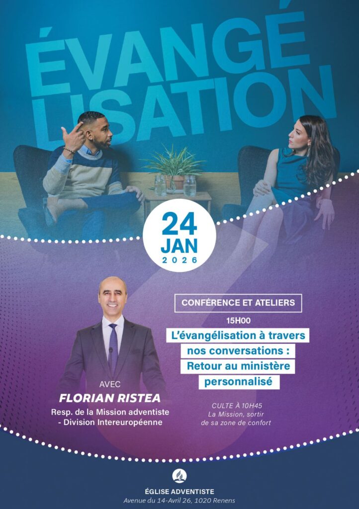 Demain, sabbat 24 janvier, à l’église de Renens, Florian Ristea, Responsable de la Mission adventiste de la Division Intereuropéenne partagera un message le matin et une conférence avec des ateliers l’après-midi.